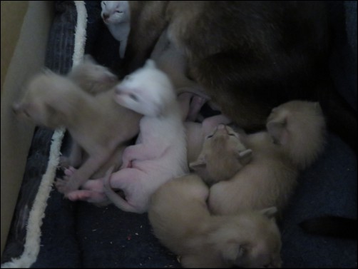 This second time round Columbae carried off her pregnancy with ease and in a very "chilled out" manner. She was extremely large and I knew she would have a large litter. Sensible and considerate girl she waited until the weather had cooled a little and it was not too early in the morning before she went into labour. A long labour with reasonable rests between kittens, the only problem arising with the sixth kitten which was stillborn, once he was delivered the next four came fairly rapidly. First indications are that there are four of each sex. All kittens feeding well and are a very contented bunch.