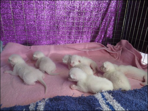 Mist is a wonderful new mum, she had the advantage of sitting in when her brothers & sisters were born and then babysitting up until her own arrived on the scene. Only trouble was she wanted to mother both her kittens and her Mums, so they have had to be separated. Mist had no problems during the delivery and all kittens were born at regular intervals, normal presentation and no complications. Mist is ultra protective of them and refuses to leave the birthing pen. There are seven kitts, four male and three female, all of an equal size. A few days on and the kittens are growing rapidly.